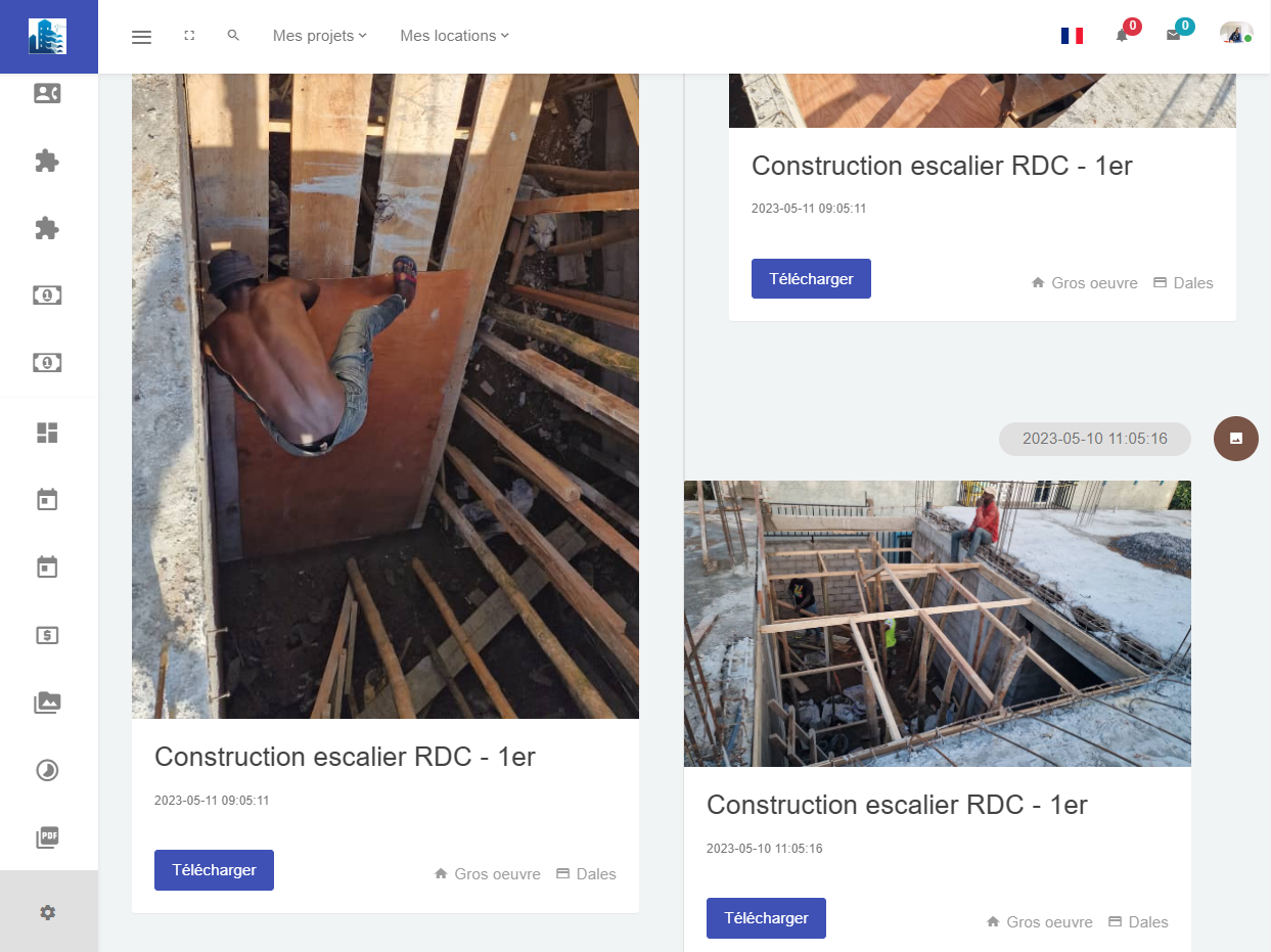 Depuis votre espace client, vous pouvez voir les médias (photos, vidéos, audios, ...), les échéances (sous forme de calendrier, gantt, ...) ... qui vous donnerons une vision claire de l'état d'avancement de votre projet de construction. Les éléments sont chargés par nos équipes chaque semaine. Vous pouvez aussi souscrire au pack vision temps réelle pour voir votre chantier à votre convenance grâce à nos solutions de vidéosurveillance.